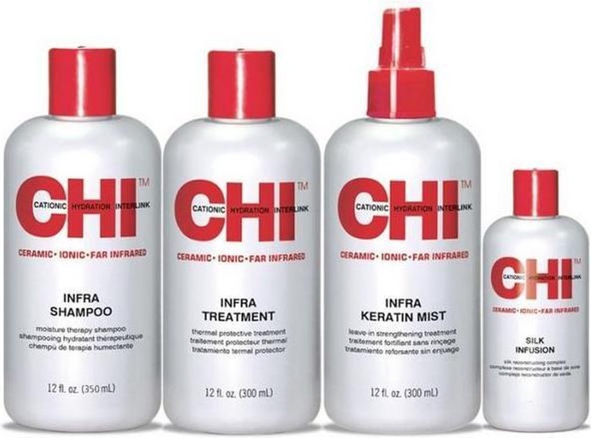 Breng een kleine hoeveelheid CHI Infra Shampoo aan op nat haar. Masseer de shampoo in totdat deze schuimt. Spoel de shampoo grondig uit met water. Breng vervolgens een kleine hoeveelheid CHI Infra Treatment aan op gewassen haar. Masseer de treatment zachtjes in en laat deze enkele minuten intrekken, daarna goed uitspoelen met ruim water. Breng daarna een kleine hoeveelheid CHI Silk Infusion aan op de handpalmen en verdeel dit door het haar. Richt hier vooral op de punten van het haar. Silk Infusion en CHI Keratin Mist kunnen zowel op nat als droog haar worden aangebracht en hoeft niet uitgespoeld te worden.