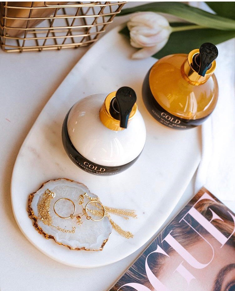Giftset van Gold met handzeep en handlotion, verpakt in fluwelen tasje.