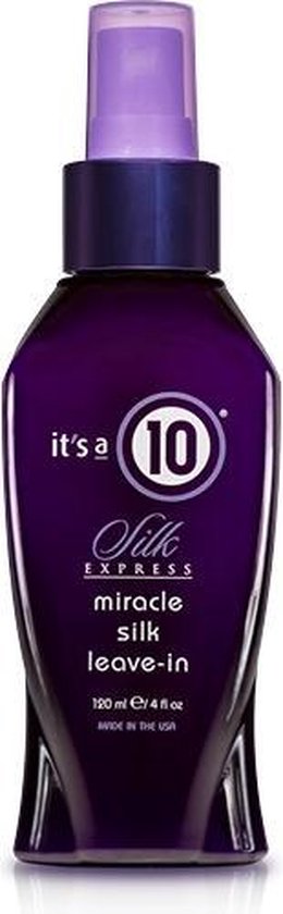 Een verzorgende leave-in conditioner met zijde die je haar glad en glanzend maakt. Deze It's a 10 Miracle Silk Leave-in heeft de kracht en prestaties van zijdeproteïne. Spray en kam door nat of droog haar voor een opmerkelijk verbluffende glans en gladheid. Klitten glijden er moeiteloos uit, terwijl aanvullende conditioners de lokken van wortel tot punt herstellen en versterken. Het resultaat is sterkere, langere, glanzender lokken die beter reageren op styling en omgevingsfactoren zoals vochtigheid of droogheid. En, zoals je zou verwachten van zijde, geeft It is a 10 Silk Express Miracle Silk Leave-In Conditioner een finish die lichter is dan lucht. De leave-in verkort de droogtijd van je haar. It's a 10 Miracle Silk Leave-in is verijkt met ingrediënten zoals: Gehydrolyseerde zijde: een gemakkelijk opneembare zijdeproteïne-formule die de natuurlijke lichtgewicht vochtbalans herstelt en tegelijkertijd kracht en glans toevoegt. De belangrijkste kenmerken: * Leave-in conditioner die je haar glad maakt * Beschermt tegen hitte en UV-straling * Spray formule * Geeft prachtige glans * Herstelt het haar * Maakt het haar sterker * Lichte finish * Verkort de droogtijd