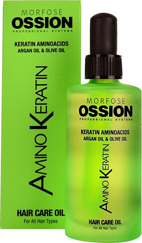 Ossion Aminokeratin Hair Treatment Oil is een speciaal geformuleerd met Keratine Aminozuren en Arganolie. Het is een intensieve leave-on behandeling die de schubbenlaag beschermt en de vliesvorming vermindert zonder zwaar aan te voelen. De keratine aminozuren helpen om de sterkte van het haar van binnenuit te verbeteren, Vitamine E in Argan Olie zorgt voor glans en zachtheid.