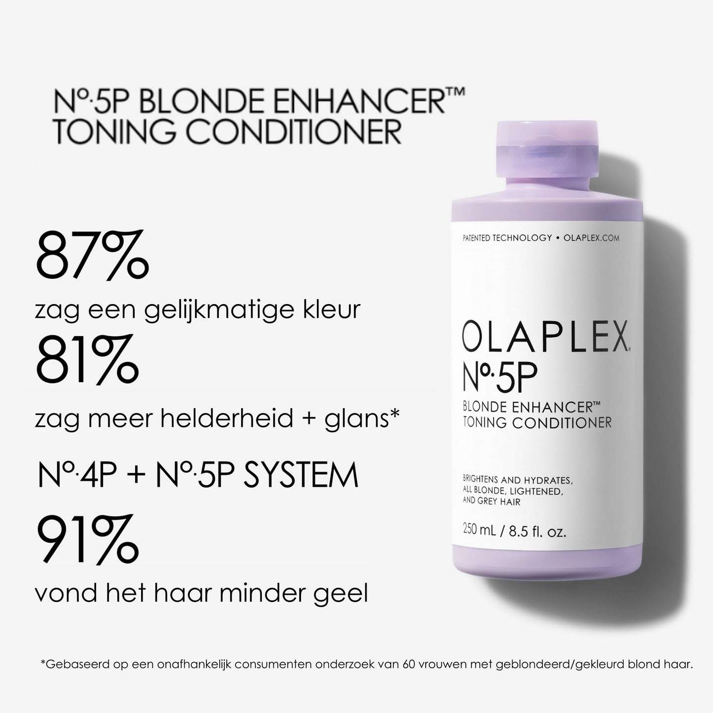 De No.5P Blonde Enhancer™ Toning Conditioner is niet zomaar een paarse conditioner. Deze voedende formule vanaf de wortels tot de punten behoudt een heldere, hoogwaardige glans en neutraliseert gele, koperachtige tinten terwijl het haar hydrateert zonder het zwaar te maken. De OLAPLEX Bond Building Technology™ versterkt blond en grijs haar.